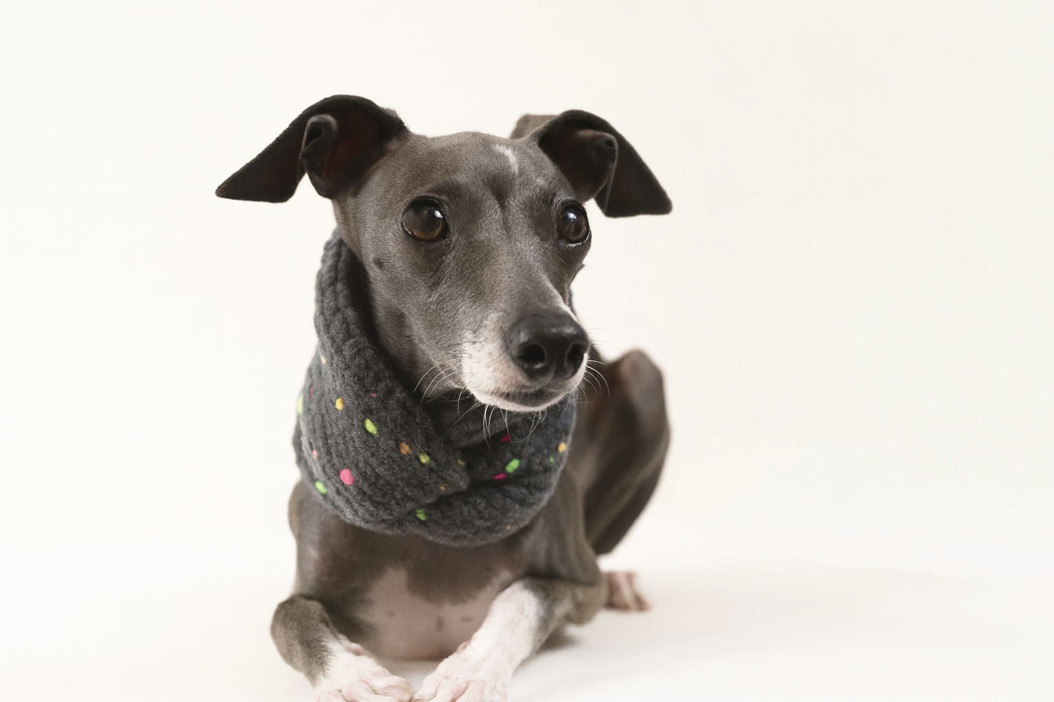 Premium knitted Chunky Mouse Grey Confetti Fluffy Chenille Knitted Neck Warmer Scarf. Protecting your Italian Greyhound or Whippet from the cold has never been easier. Made out of a luxurious, thick yarn that has a slight stretch. Designed like an infinity scarf, that easily slips over your Italian Greyhound or Whippet's head. Adding a extra layer of warmth that protects slender necks from the cold. The twist of the design can be worn in the center, either sides or the back of the neck. All designed to adequately serve that hound in your life.